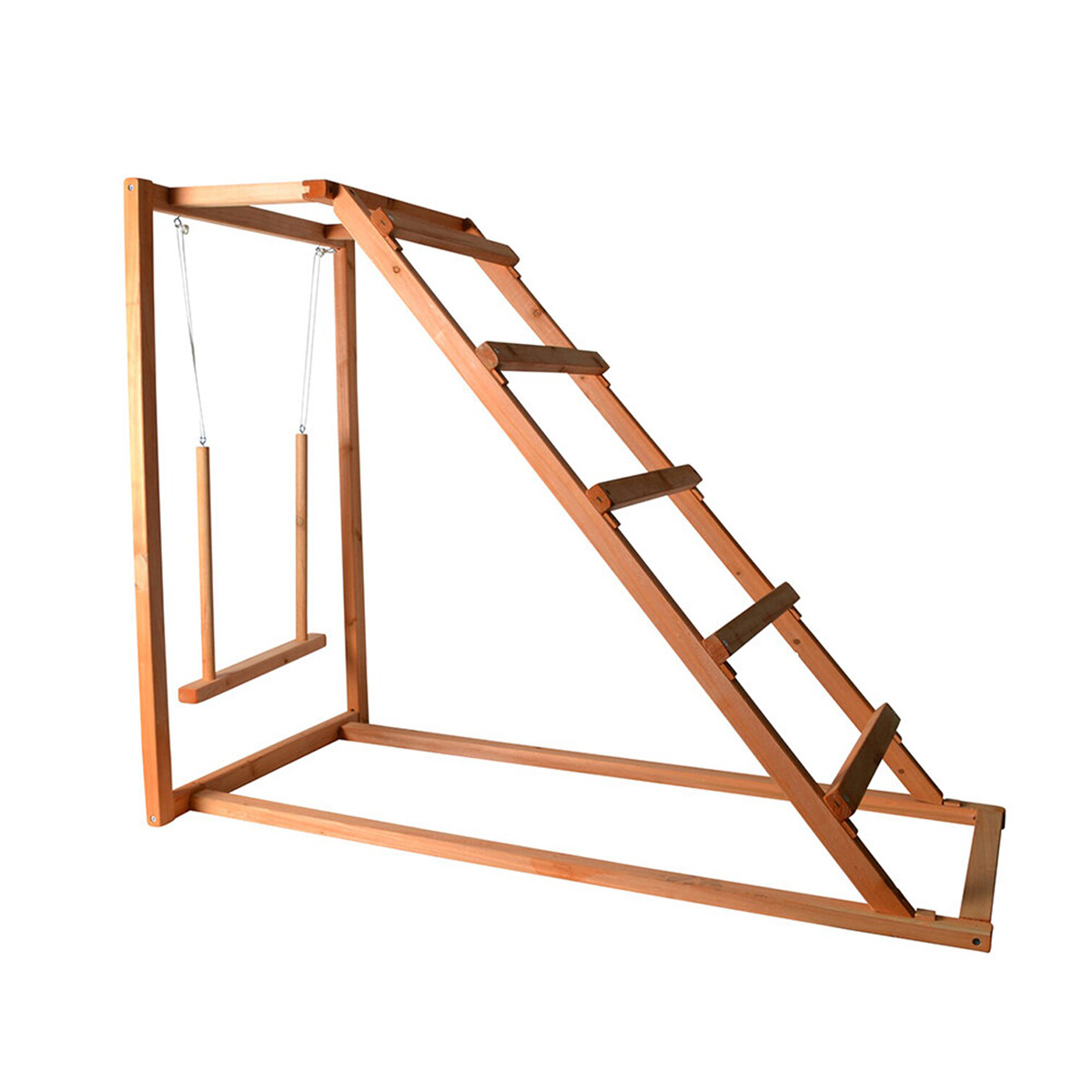 Aktivitetscenter i trä till höns. Innefattar 5 trappsteg, galgar och en gunga. För inomhusbruk.