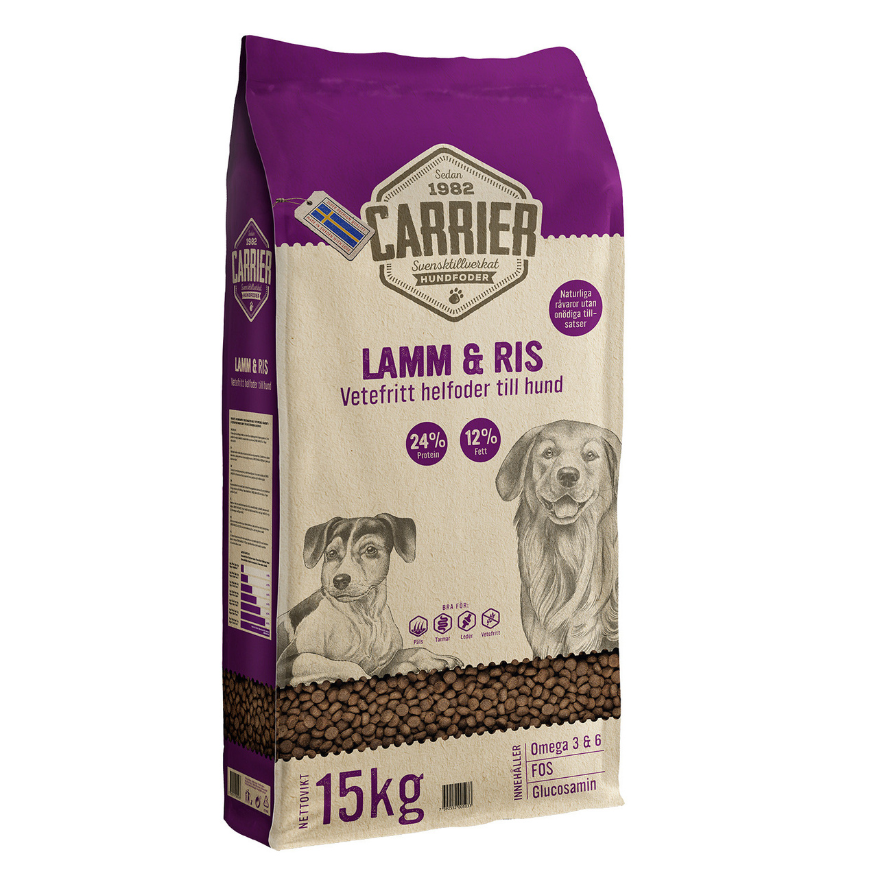 Et hvetefritt fullfôr for normalt aktive hunder av alle raser. Inneholder kun lam som kjøttprotein og er et meget skånsomt fôr som godt kan passe for kresne hunder eller hunder som lider av allergiproblemer av noe slag. Anbefales på det sterkeste for hunder med kløe. Carrier Lam & Ris er laget av lettfordøyelige råvarer av høy kvalitet.Art.nr 503