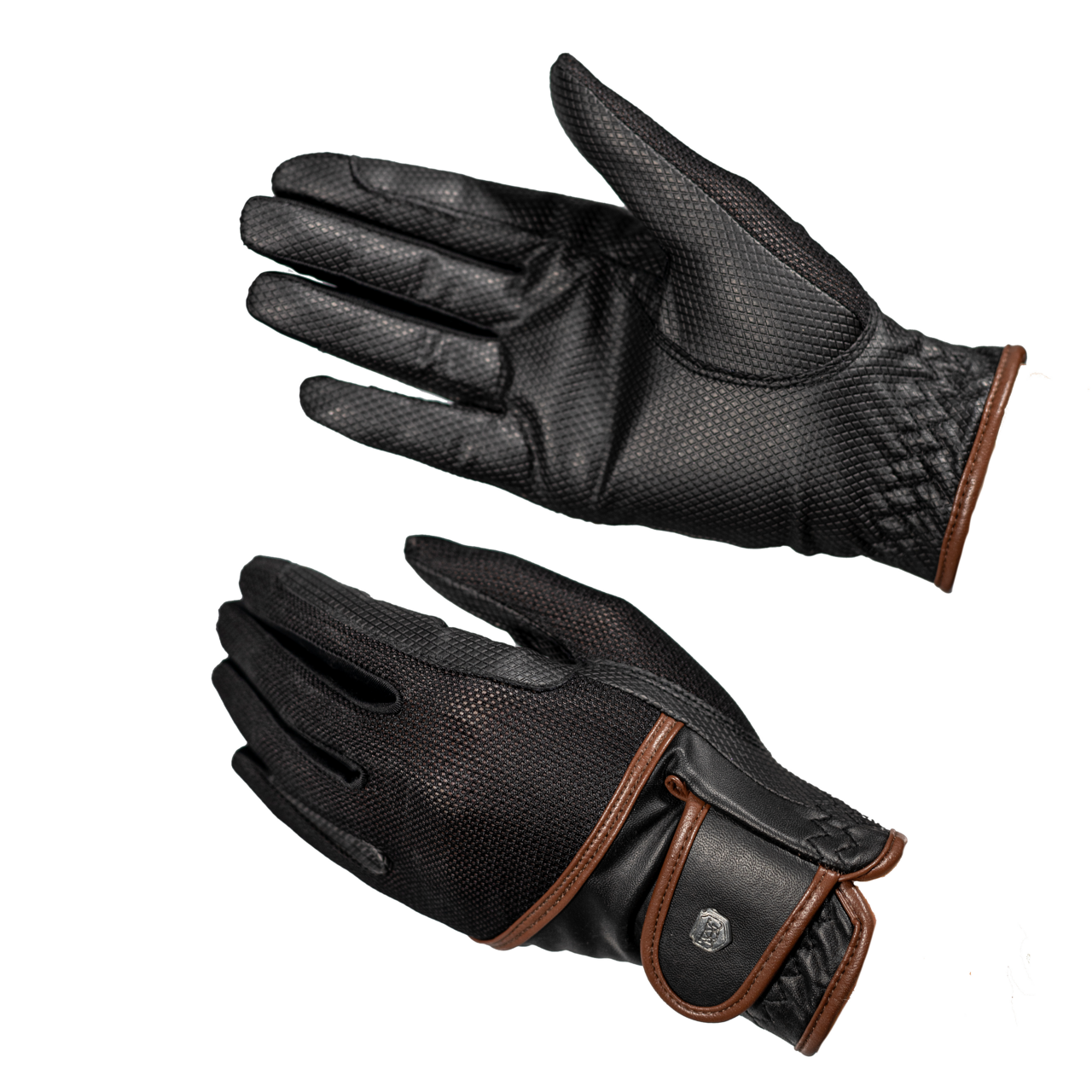 Ridhandske med bruna detaljer och mesh-paneler för andningsfunktion. Undersida tillverkad i greppvänligt material. Sluts med kardborre vid handled.
