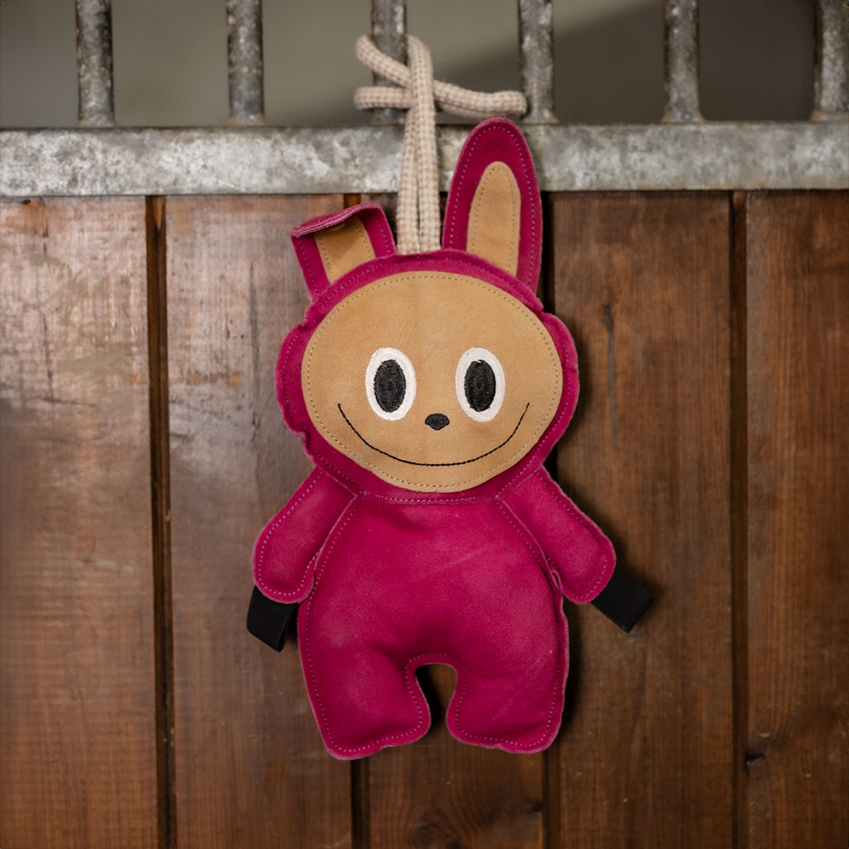 Hästleksak i mocka, perfekt för både funktion och dekoration. Utrustad med ett kraftigt rep för enkel upphängning samt resåröglor vid händerna – idealiska för att fästa exempelvis morötter eller andra godsaker.