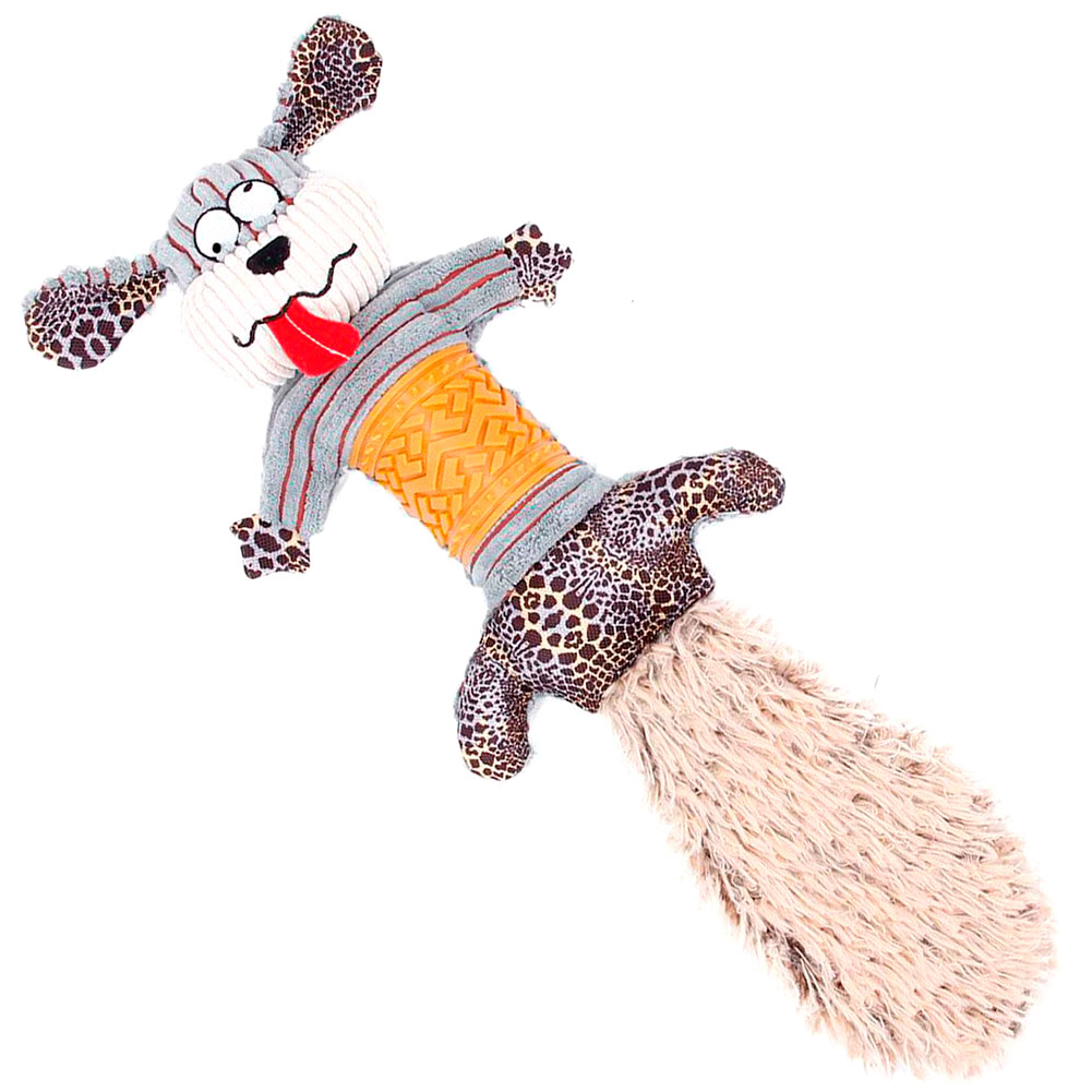 Flermönstrad leksak med stor svans till hund. Gummiplatta på magen för extra tålighet. Prassel i svansen. Tillverkad i plysch.