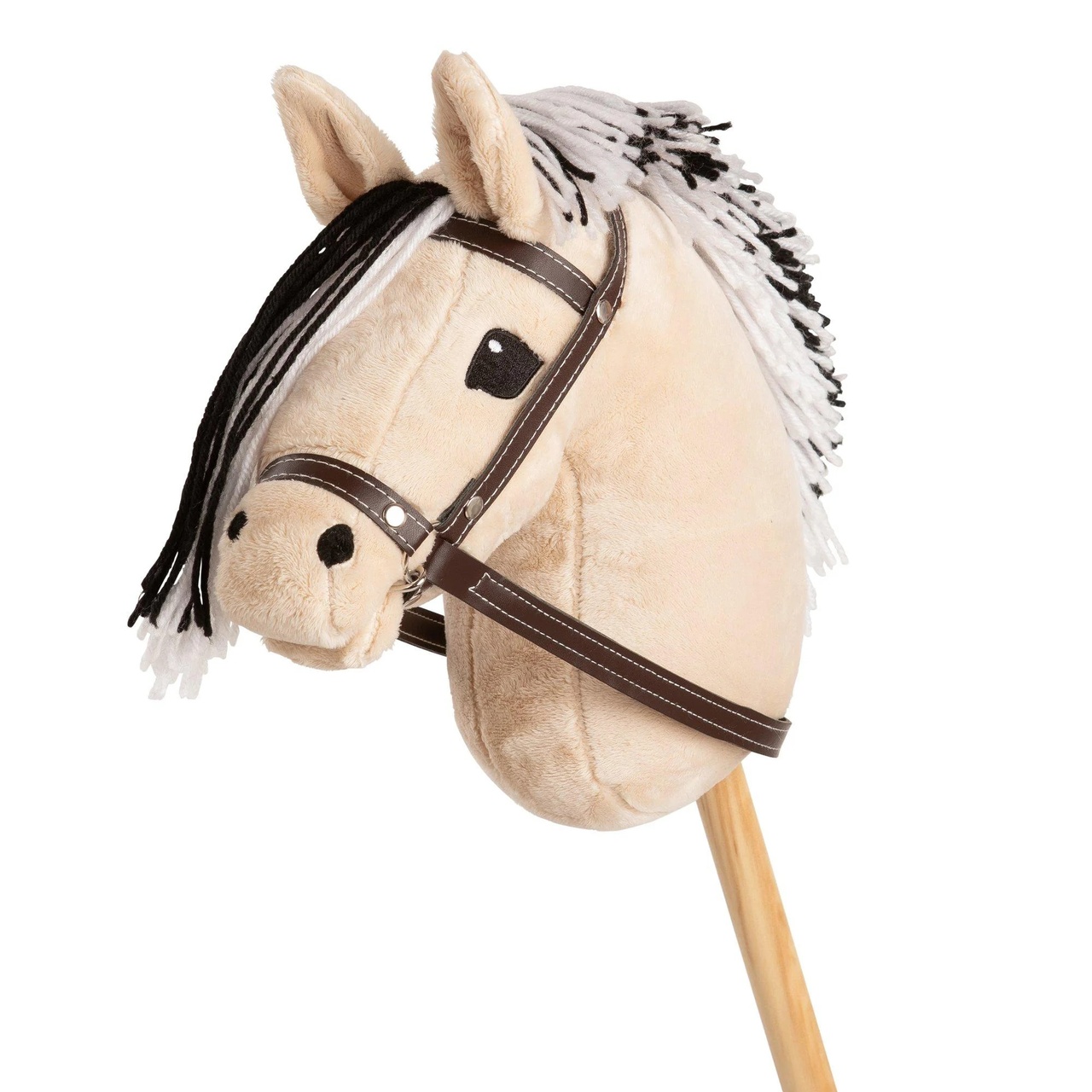 Käpphäst Greta med fastsytt träns, pannlugg och man i garn. Käpp av trä. 80 cm.
