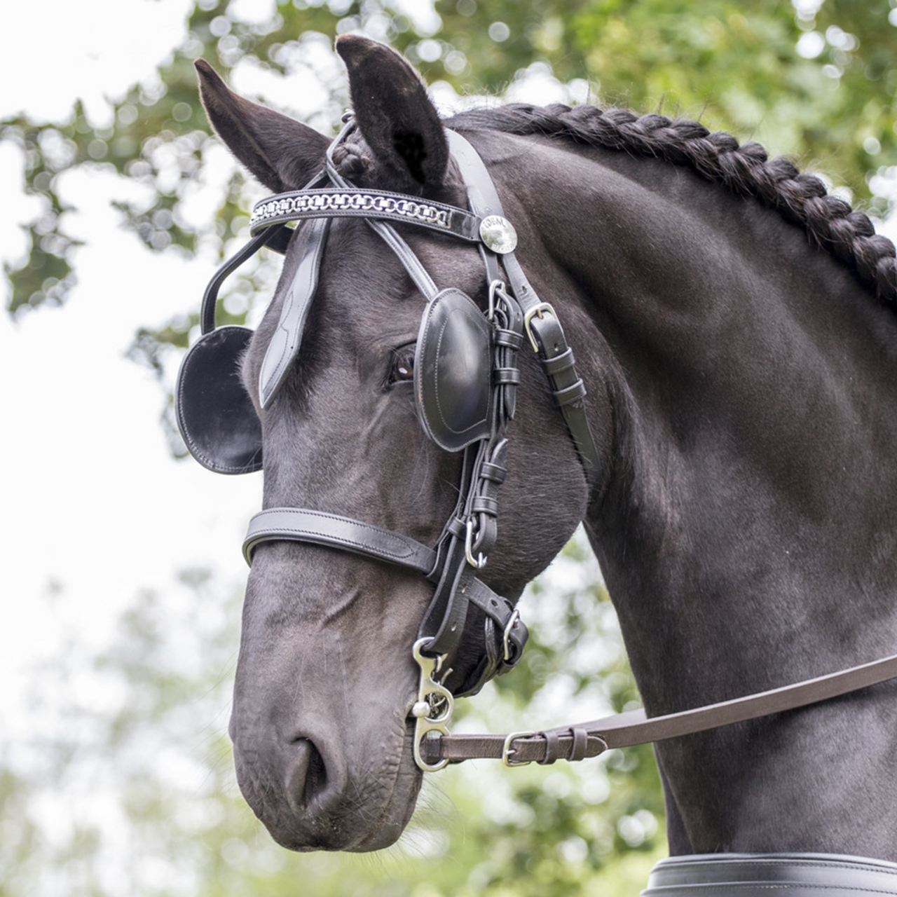 Med metallforsterket skyggeskinn. Justerbar nesereim i høydeledd. Pannebånd til størrelse Ard/Sh mangler kjede, er kun i skinn.