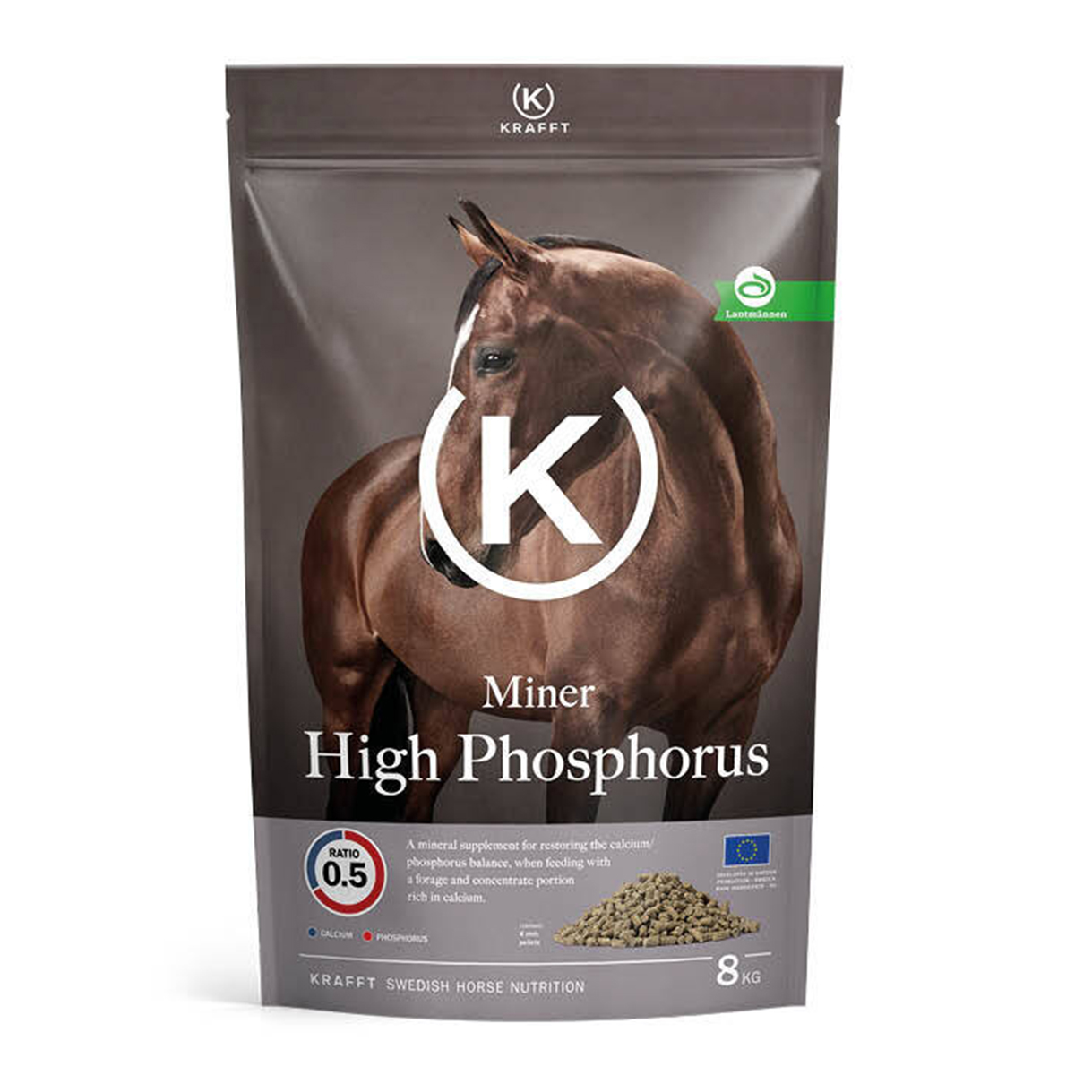 Pelleterat mineraltillskott för att återställa mineralbalansen vid kalciumrik grovfodergiva. Ca/P kvot 0,5.