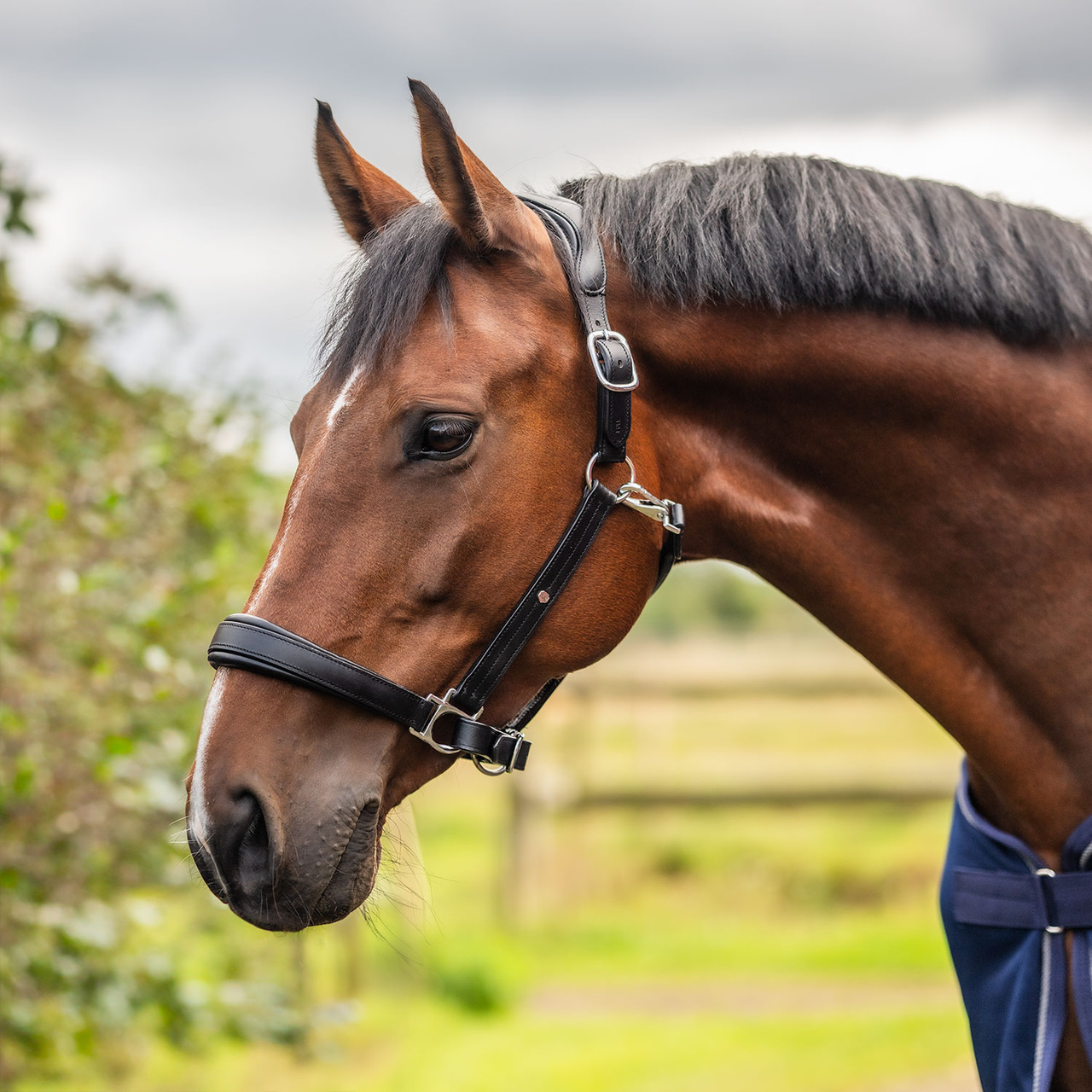 Lädergrimma med anatomisk format nackstycke. Rundsydd under käken. Justerbar i nacke och nos. Silverfärgade spännen och svarta sömmar.