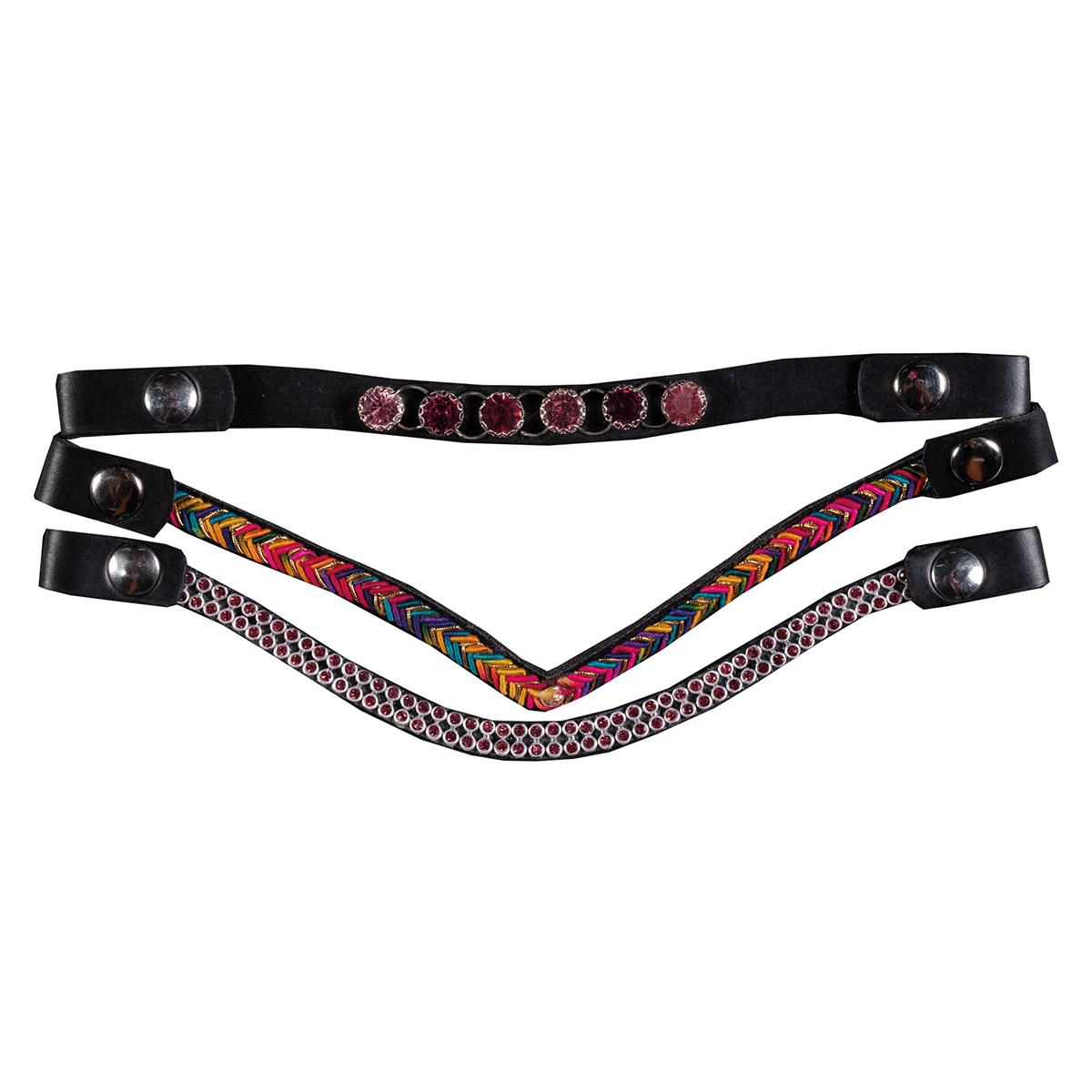 Sett med 3 rosa, dekorativt pannebånd til kjepphester. Fremstilt i lærimitasjon/kunstlær.