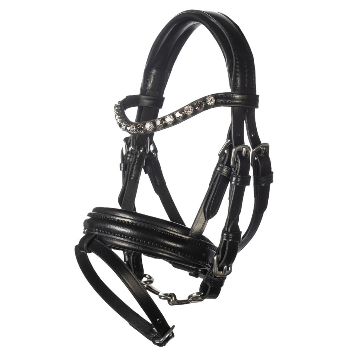 Träns i läder till käpphästar. Bred nosgrimma och pannband med blingstenar. Tränset är ställbart.